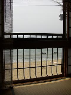 畳の部屋にすだれ、その向こうに海です