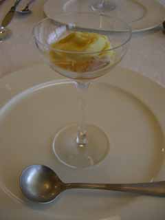 とうもろこしスープは、なめらかーなシャーベットで、コンソメのゼリーを一緒にいただきます。