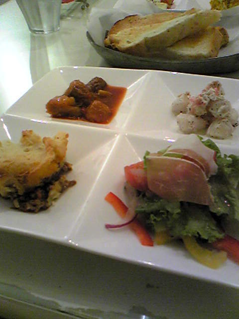 ちゃんとした名前ではないのですが、ポテトグラタン、生ハムのサラダ、ホタテと海老のサラダ、牛筋のトマト煮込みの4種