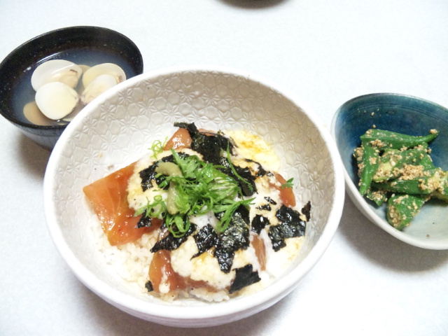 マグロ丼にはまぐりのお吸い物、オクラの胡麻和えにしました。