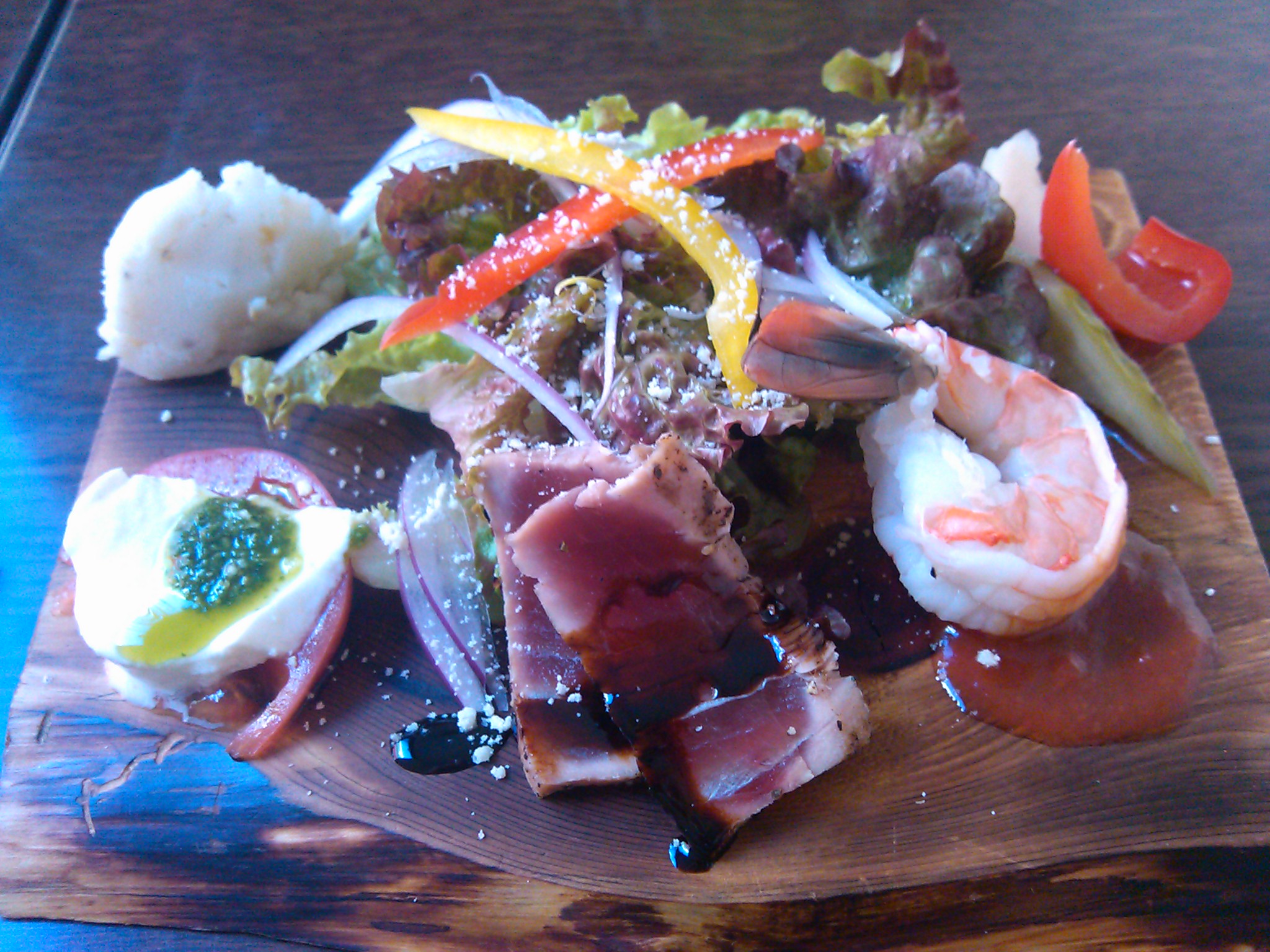 サラダの周りに自家製ピクルス、大きなエビ、トマトとモッツァレラ、マッシュポテト、カツオのたたき