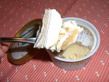一つ一つの層を別々に食べてみると、アイス部分は甘さがかなり控えてあって、そんなに目立った味はないんですが、上のマロンクリームを、中間層にあるケーキ部分とトータルして食べると、程よい味になるんです