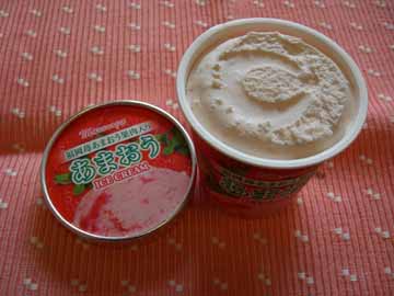 地元福岡のイチゴあまおうの果肉が入ったアイスです。