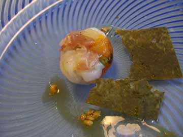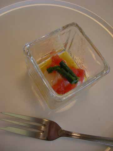 とうもろこしスープは、なめらかーなシャーベットで、コンソメのゼリーを一緒にいただきます。