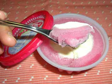 一口食べると、懐かしい、そしてある意味安っぽいイチゴ味!真ん中のバニラも真っ白で高級感はまるでなし。
