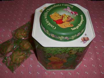 ぷーさんのかわいい缶の中に、チョコクリームの入ったクッキーがたくさん