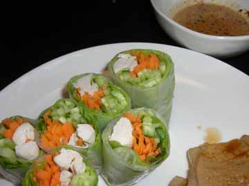 レタス・キュウリ・ニンジン・鶏のささみをクルクルまいて、ゴマドレッシングでいただきます。