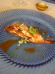 左:”松島”足赤海老のグリル柑橘有機人参バターソース